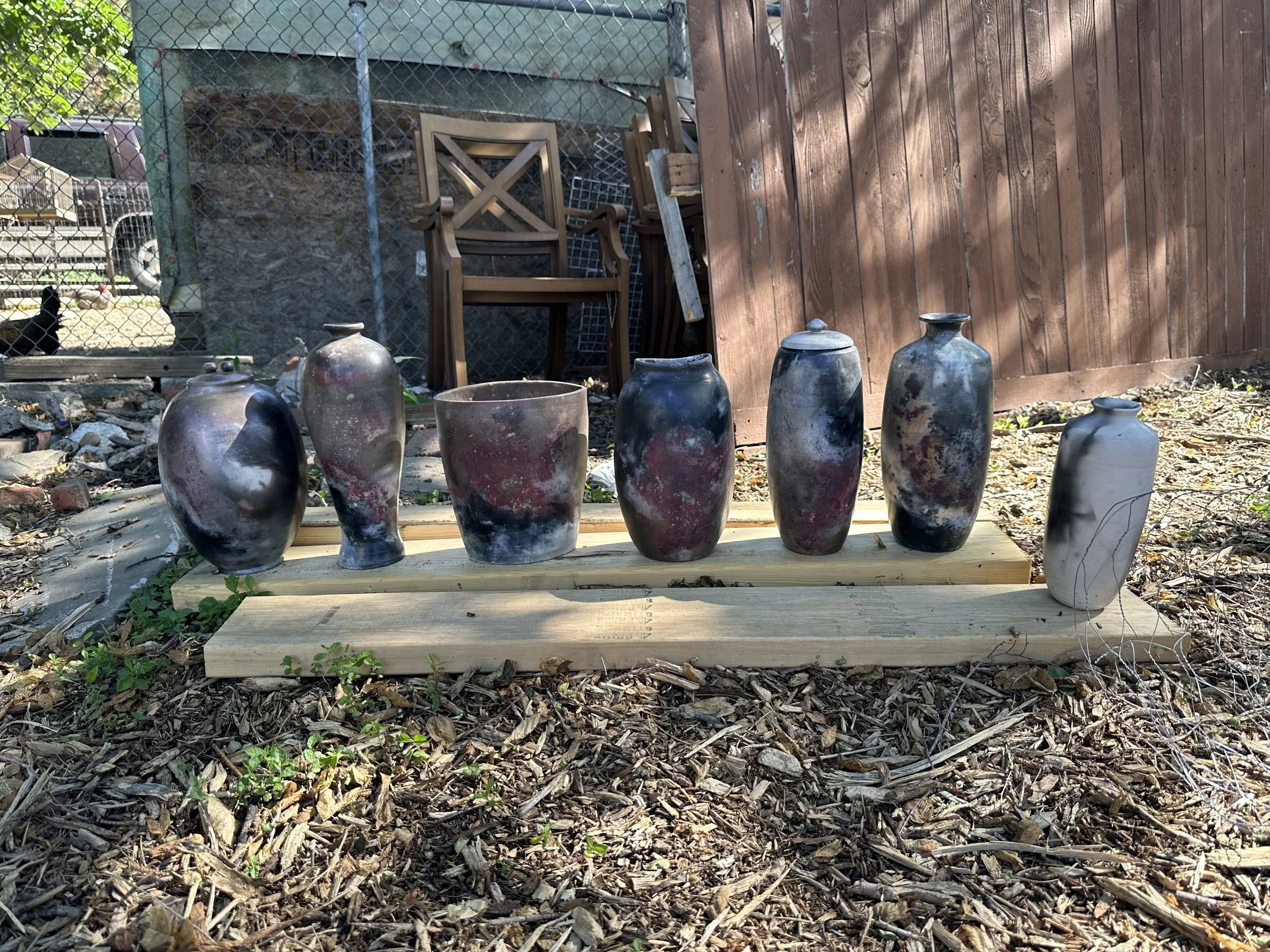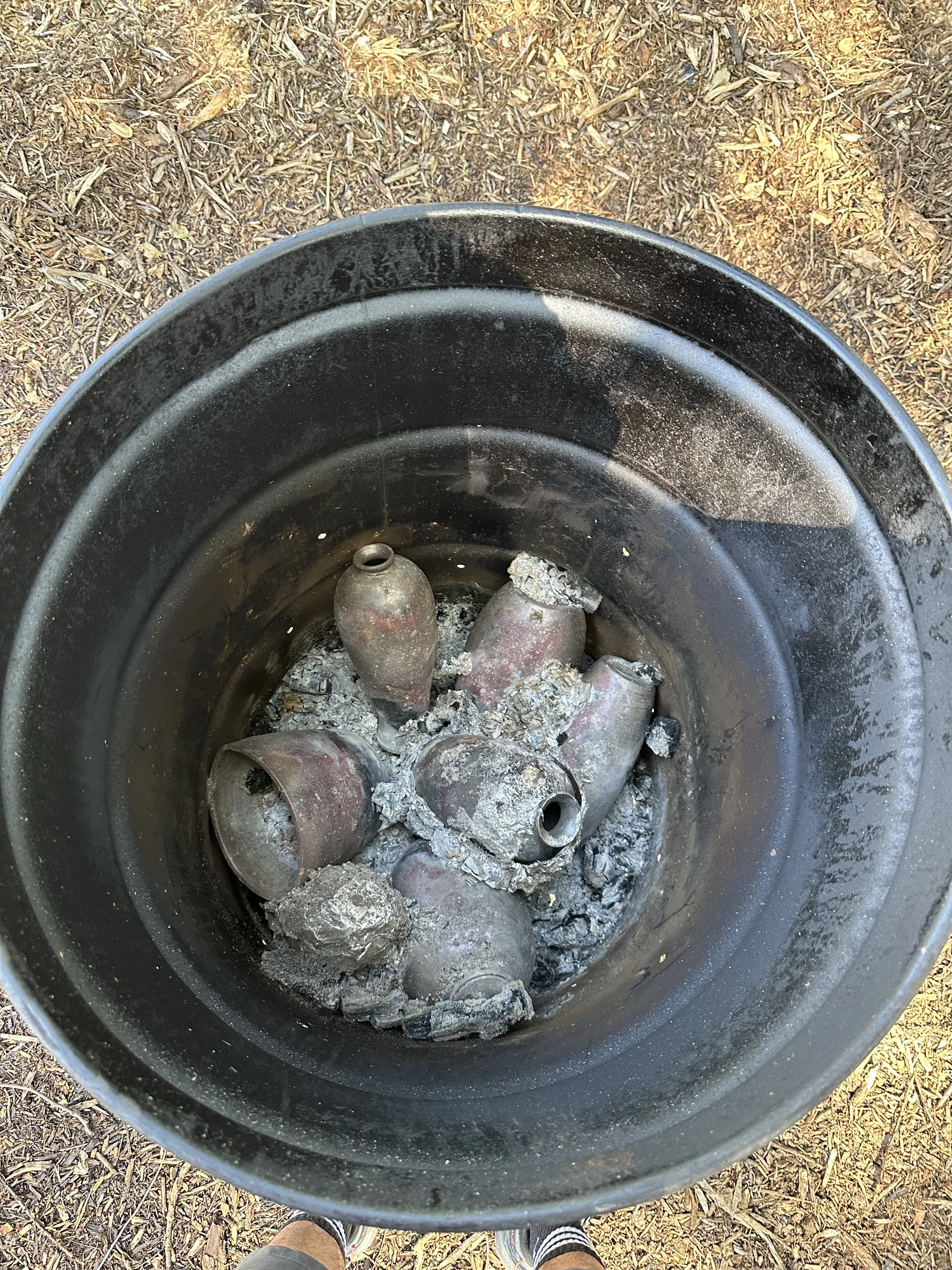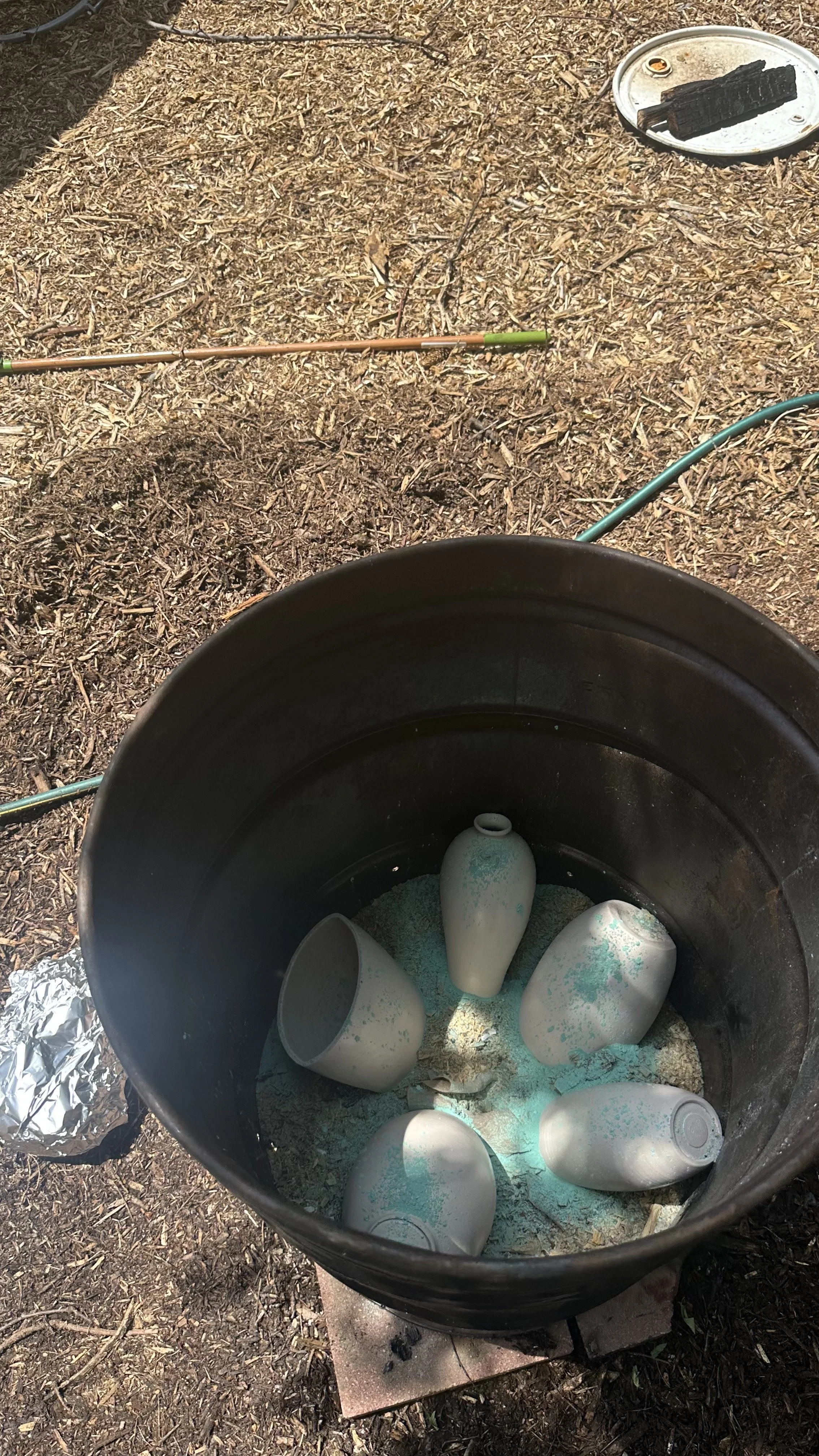 The fire took about two hours to burn down to embers but I left the pieces in until the next morning until I could remove them. My key changes I wanted after the first firing was that I kept trying to cover the barrel as this is what we’d done at WHAC for their firings, but the pit there has piping through the bottom to provide airflow in the sawdust whereas mine does not so this lead to pretty heavy reduction when even partially covered for a minute. You can see some of the results of this in how heavily greyed the pieces are instead of leaving white patches. The second change was a lack of color variety. Only the reds from the copper carb came through so I introduced both a salt and more of a potassium source for the second go. But overall I thought quite good results from my first attempt.