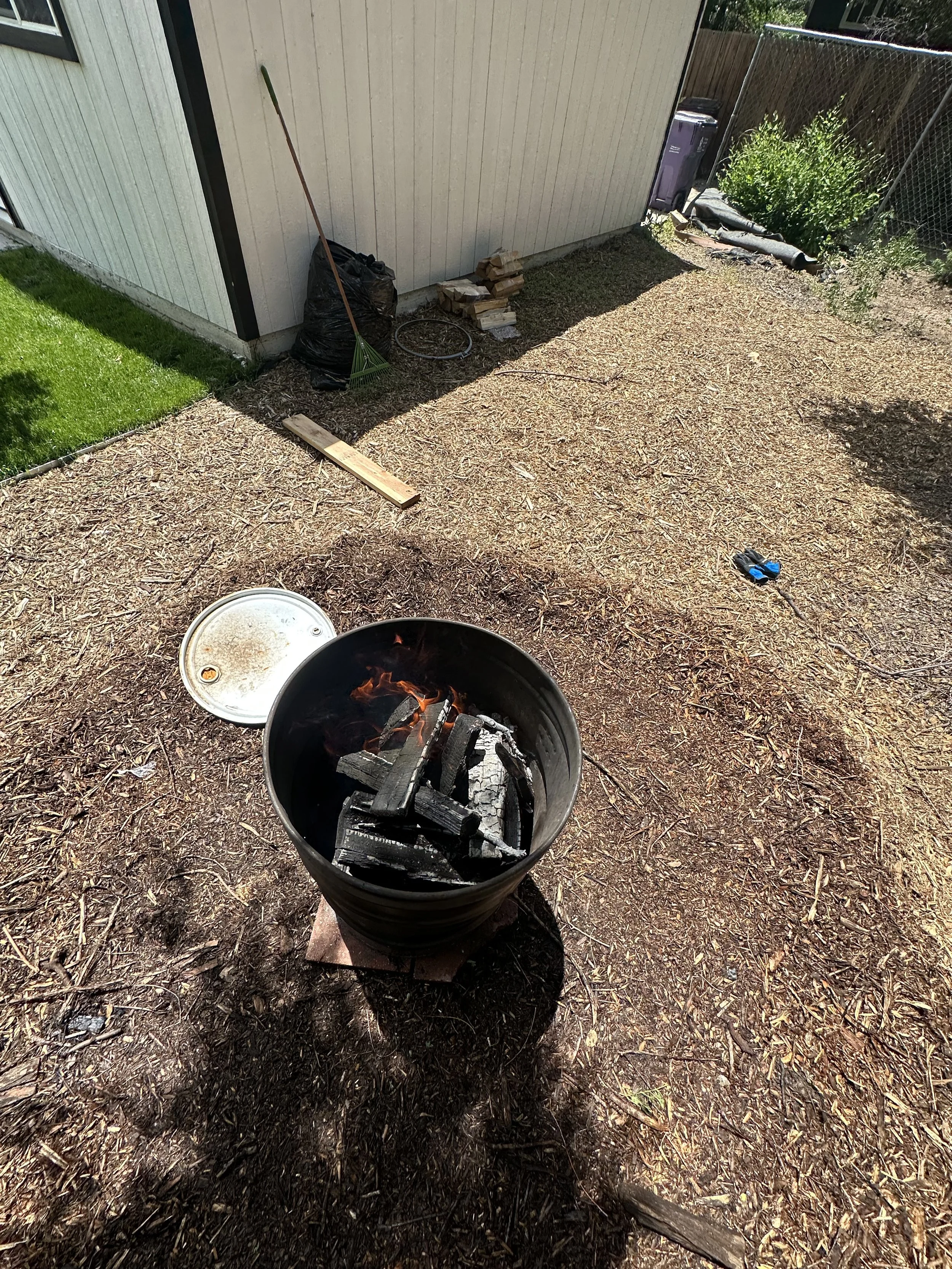 In the past I’ve been doing my pit firings at Washington Heights Art Center (WHAC) and gotten good results, but both because that’s getting expensive and to have greater control I started doing the firings on my own. Since I live in an apartment I obviously couldn’t do these on my balcony (or at least not without very good renters insurance), so I opted for my brother’s backyard. And since I doubt he’d be very happy about me digging a big hole in his yard, my first task was to find an oil drum to convert. One of my friends from the studio was able to come through for me on this front and she gave me a used (not even rusty) one that just needed an initial fire to cook off some residuals. I spent a while trying to find free firewood around town but eventually opted to just buy some from a wholesaler who also gave me a trash bag full of sawdust no charge (pays to just ask!) I wasn’t sure how much wood I would need for the firing but I figured since a 55 gallon drum is 7.31 cubic feet and pots take up volume as well I bought six bundles at one cubic foot per half pine and half hardwood mix. Mat’s acquired and heat wave in place in town I was ready for the initial firing.