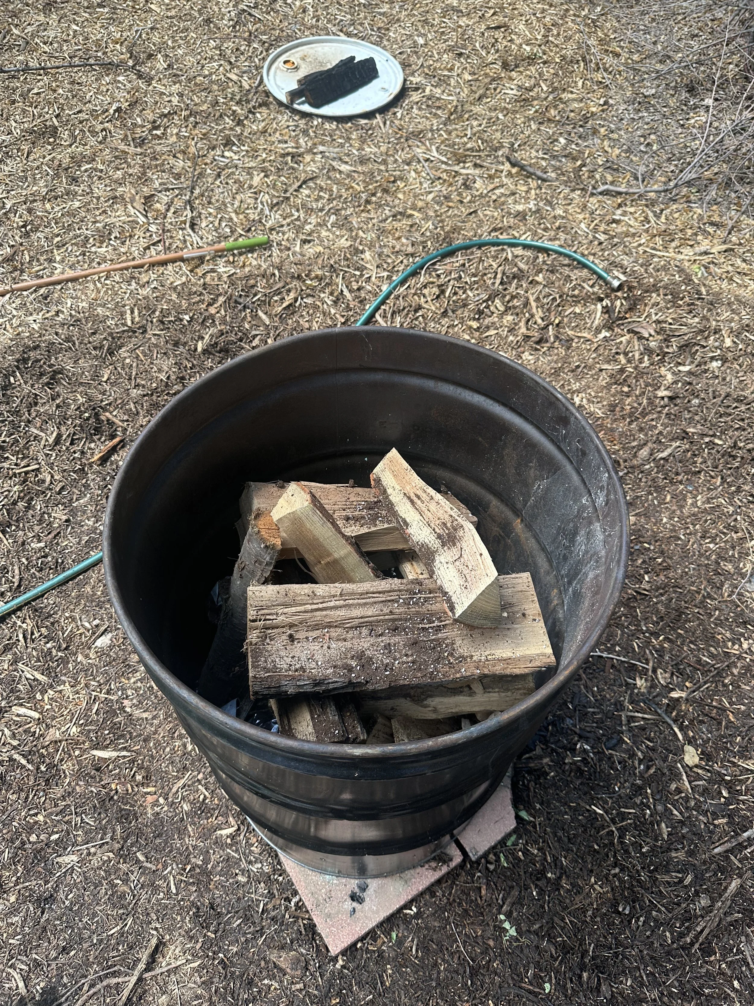 I’d seen a youtube video on converting a barrel into kiln form which is essentially just drilling some holes in the bottom and on the sides at various levels to increase airflow to the fire as well as placing a metal grate on some risers to again increase air flow so I did those. In hindsight the grate gets entirely covered in sawdust so I don’t feel it really does anything; additionally, I feel it acts as a red herring as the pots need to be placed directly in the sawdust and the grate implies the pieces can go on that above the sawdust, relevant for the second firing.